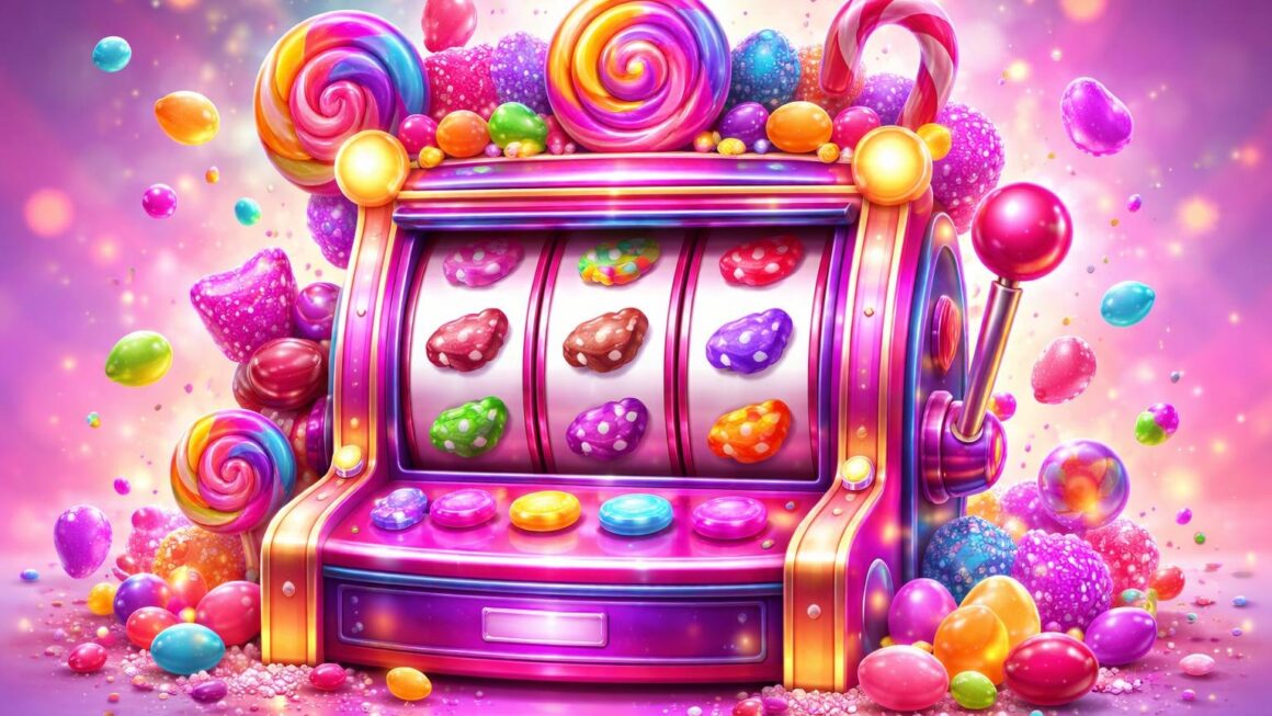Mesin slot berwarna-warni dengan simbol permen dan latar belakang pastel yang cerah.